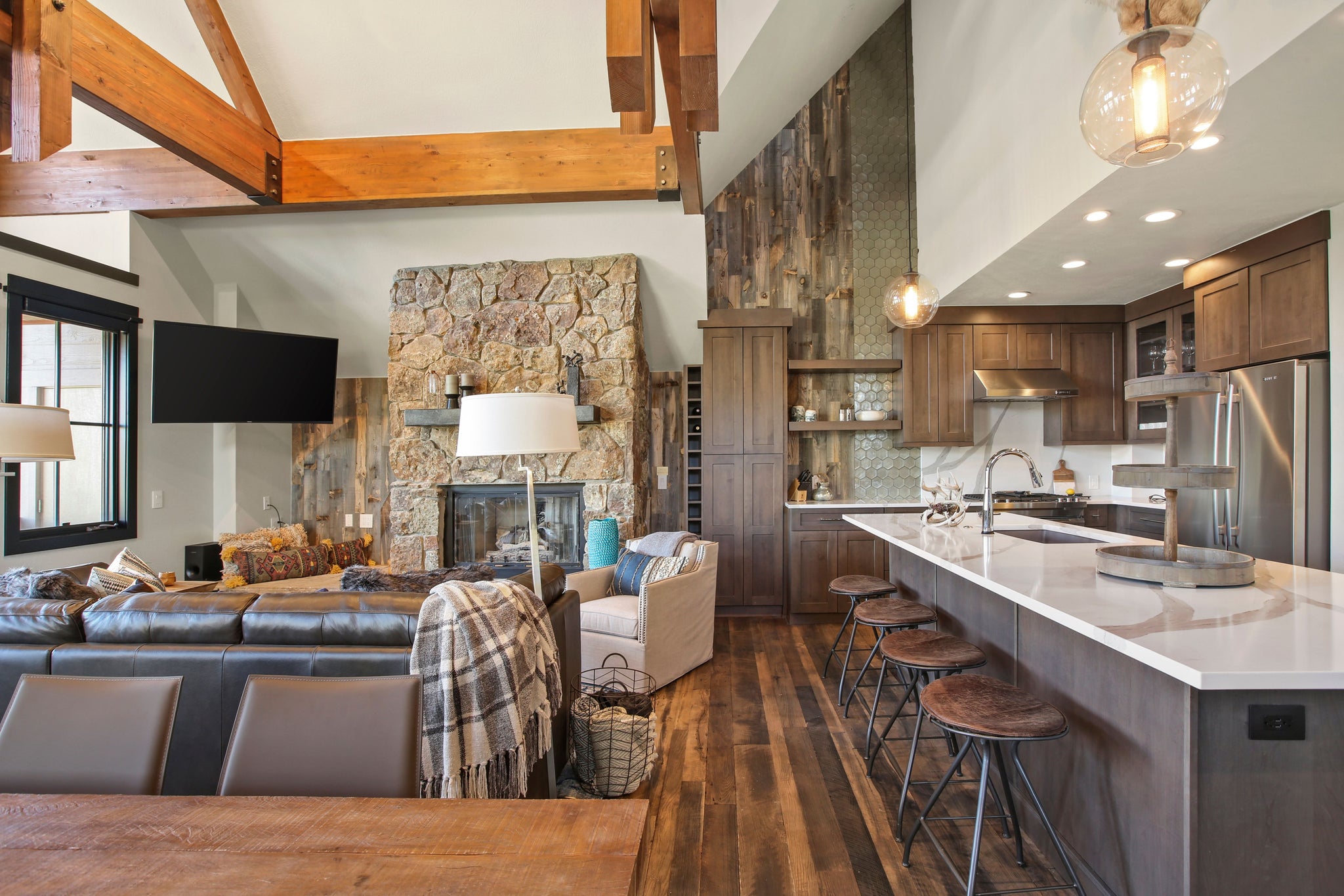 Installed alongside a cobblestone fireplace, the reclaimed weathered wood planks in this kitchen create a communal feel that’s reminiscent of old mirth-filled taverns.