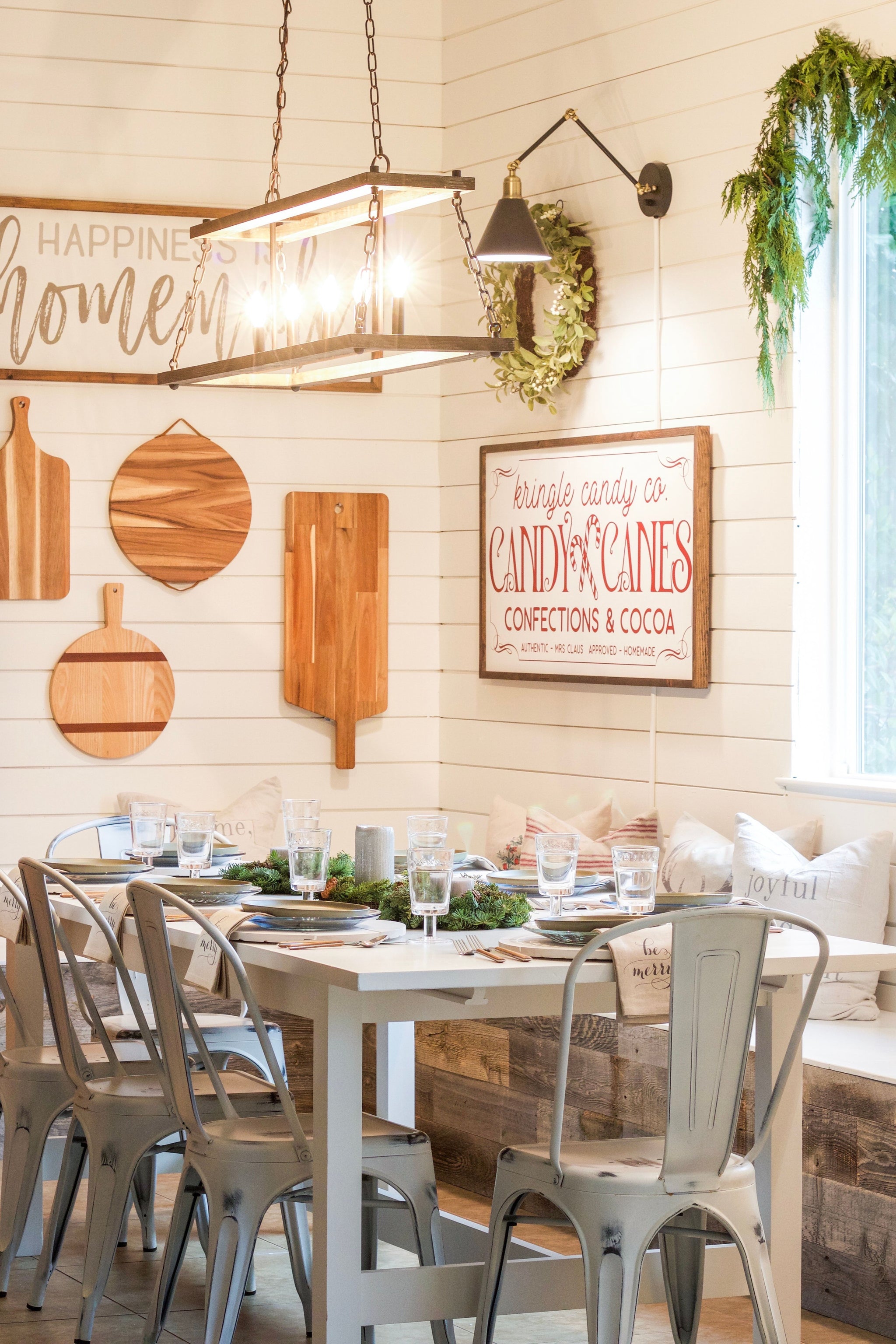 To break up the monotony of looking at a sea of white walls, take a cue from this bright and airy open floor concept with reclaimed wood kitchen walls. The designers of this room chose to adhere stick-on wood wall art in a slightly darker gray tone than the rest of the walls. In this borderless space, the wood wall art differentiates the dining area from the kitchen without losing the airy quality of the room.