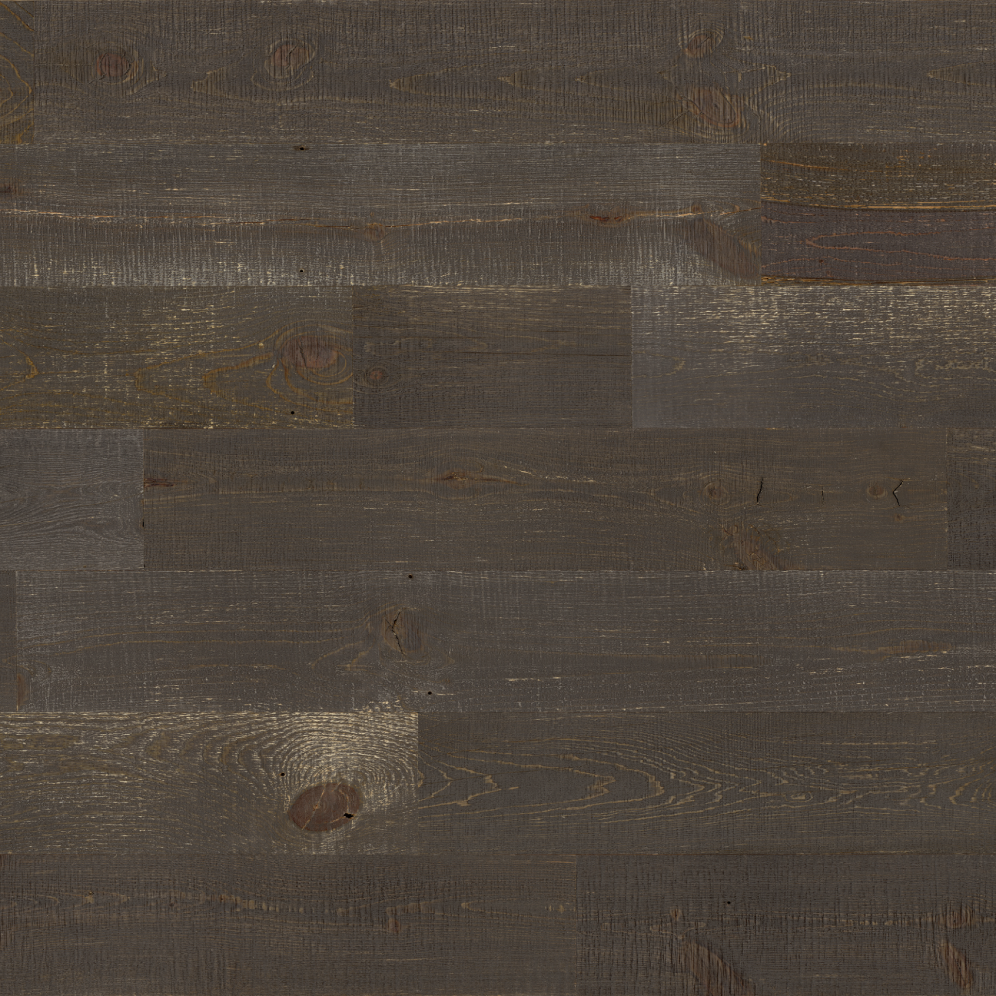 The center of each reclaimed board (the heartwood) is textured and finished to create deep colors that diffuse light and sound.